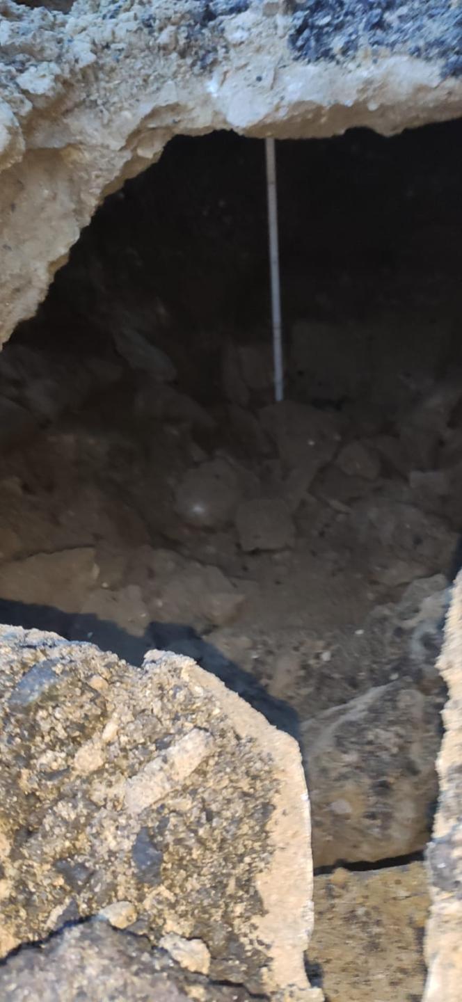 Während die Kanalhaltungen noch im alten Jahr mittels Schlauchliningverfahren saniert wurden, konnten inzwischen die Verdachtspunkte sondiert und geöffnet werden. Dabei zeigten sich Kubikmeter große Hohlräume, die tatsächlich bis unter den Straßenoberbau reichen. Diese werden nun mit mineralischem Dämmer bzw. in konventionellem Erdbau verfüllt.
