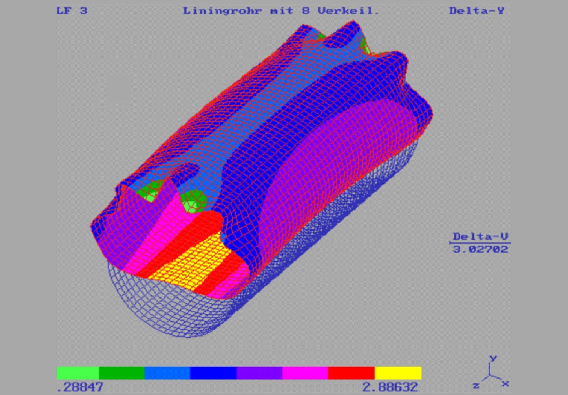 Dieser Verformungsnachweis konnte in diesem Fall nur über ein räumliches Finte-Elemente-Modell geführt werden, da die Lagesicherung des Rohres (Auftriebssicherung) nur mit acht punktuellen, sternförmig über den Umfang verteilt an den Rohrenden angeordneten Verkeilungen erfolgen sollte. Dadurch entstand eine in Rohrlängsrichtung ungleichförmige Verformung, die in einem ebenen Modell nicht abzubilden war.