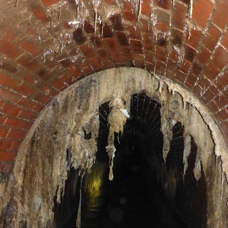 Neben den bereits bekannten Inkrustationen wurden viele durch Ablagerungen verschlossene Stutzen, korrodierte Steigeisen und Bereiche mit ausgewaschenen Fugen festgestellt. Aber auch Abschnitte ohne nennenswerte Schäden wurden aufgenommen. Das Klinkermauerwerk weist erfreulicherweise nahezu keine Korrosion auf und ist in Anbetracht seines Alters von fester Struktur.